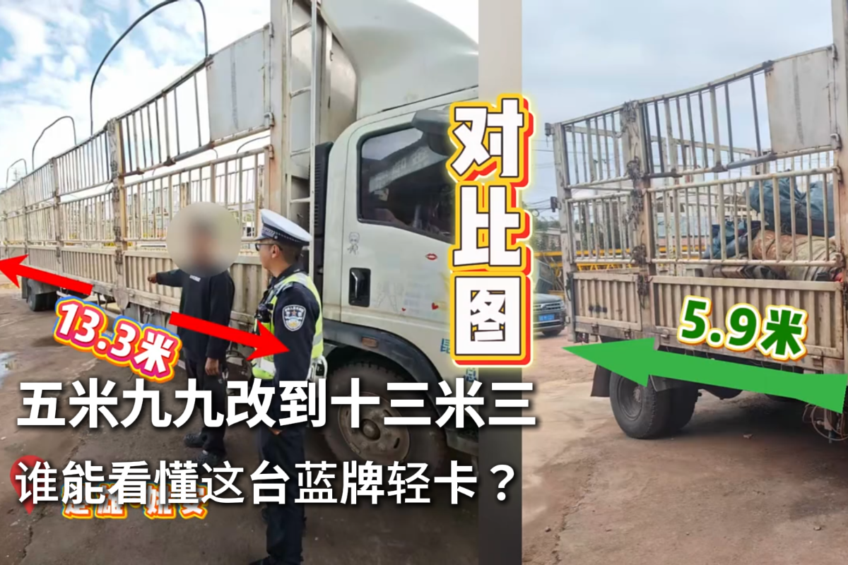 近日,云南楚雄民警在进行交通安全违法查处时,查获一辆轻型货车涉嫌非法改装。你说你要是黄牌车的话,十三米三可能真看不出来你改装了啥,关键你车头顶个蓝色牌照,后面跟火车一样谁见了不多看两眼?