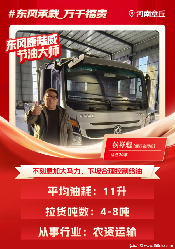 舒适、安全、省油、动力、品牌......老司机的选车之道从来都是"面面俱到",东风股份"轻型商用车国家队"的金字招牌,正是侯师傅购车的"定心丸",东风多利卡康陆威更成为了他致富路上的"最佳拍档"。当老司机"驭见"大品牌,一段又一段创富佳话正在运输路上不断上演。