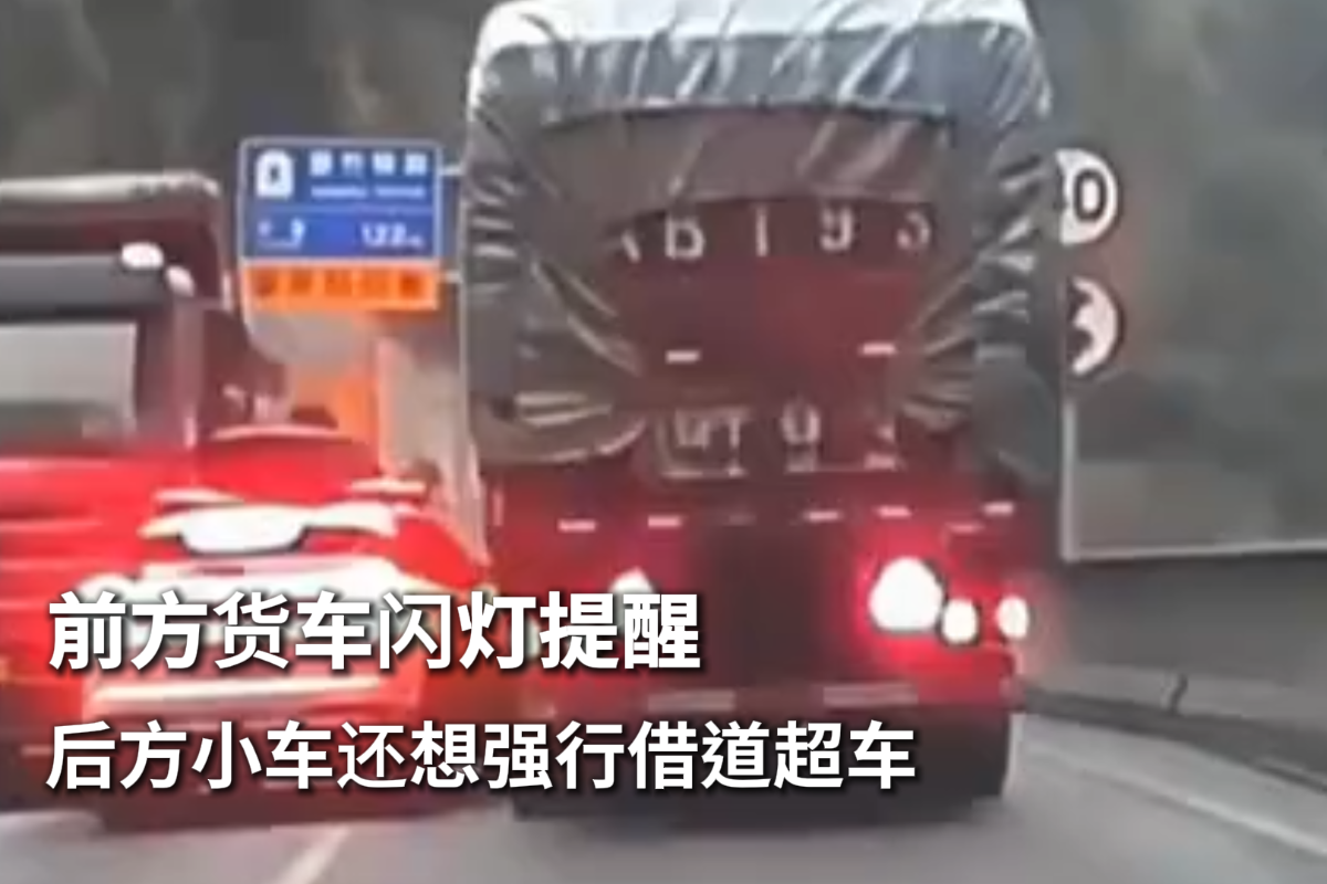 前方货车闪灯提醒 后方小车还想强行借道超车,这下出事了。
