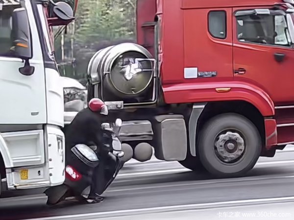 要说这位大哥也真是胆大,货车车流也敢不看路就闯,这是要比比是卡车硬还是你的命硬吗?