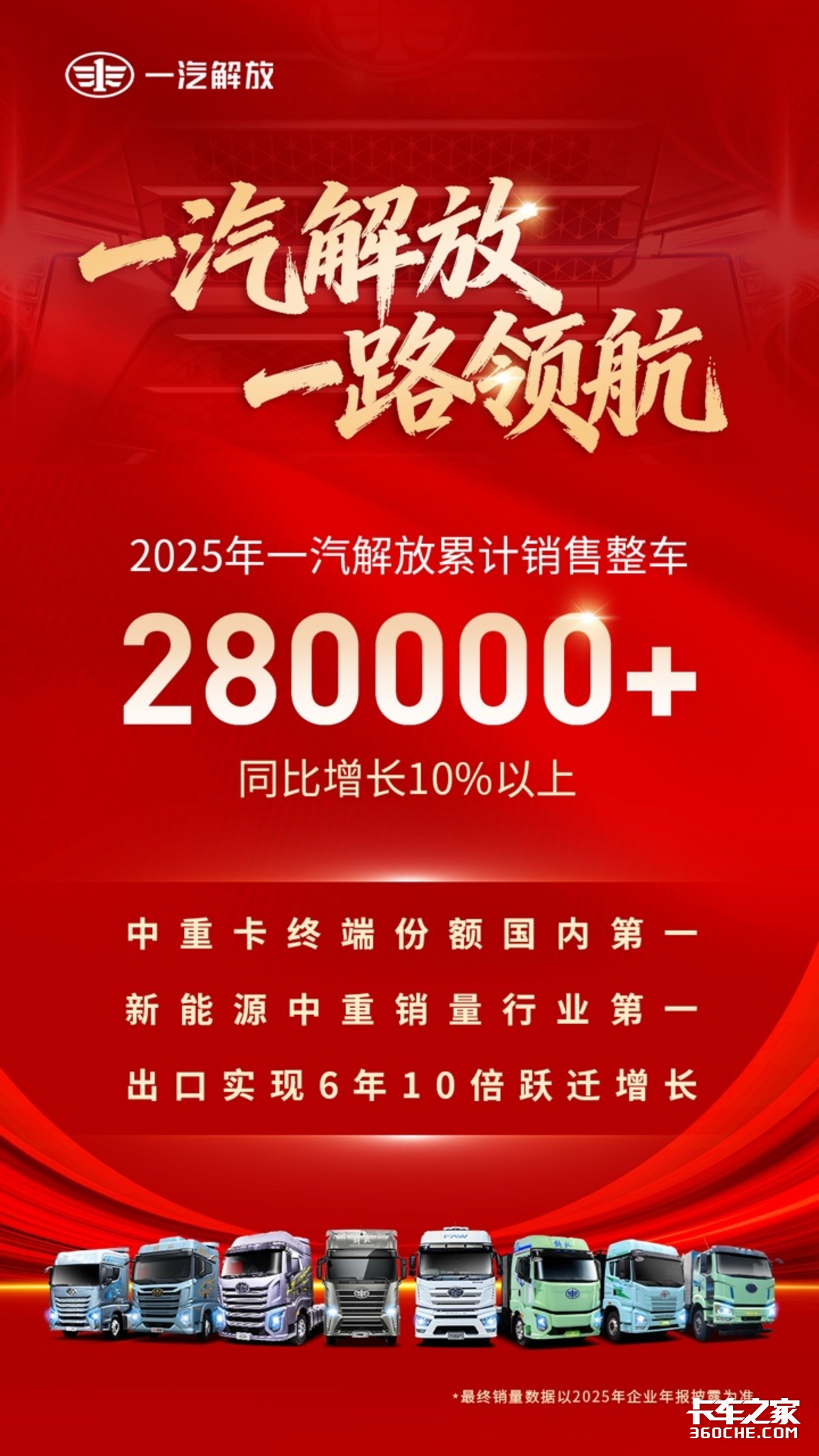 2025年,是挑战与机遇交织的一年,更是一汽解放自我超越、引领行业的一年。从制胜终端到新能源领跑,从智造工厂落成到全球生态链拓展,一汽解放每一份出彩都凝聚着全体解放人的坚守与奋斗。站在2026年新的起点,一汽解放将继续以“自主自强”的初心砥砺前行,建设“科技解放、绿色解放、国际解放”,推动企业实现跨越式新发展,奋力打赢“十五五”开局战!