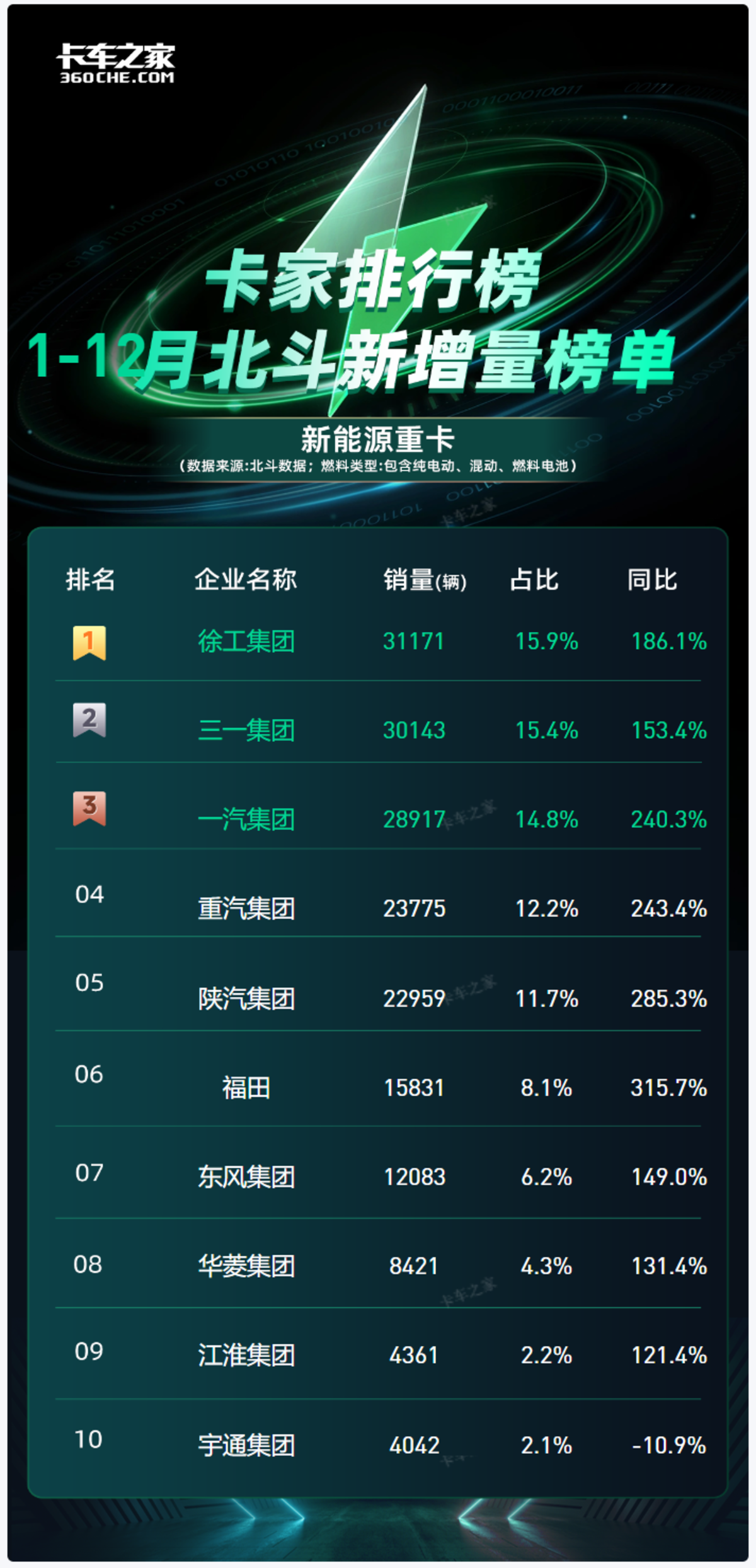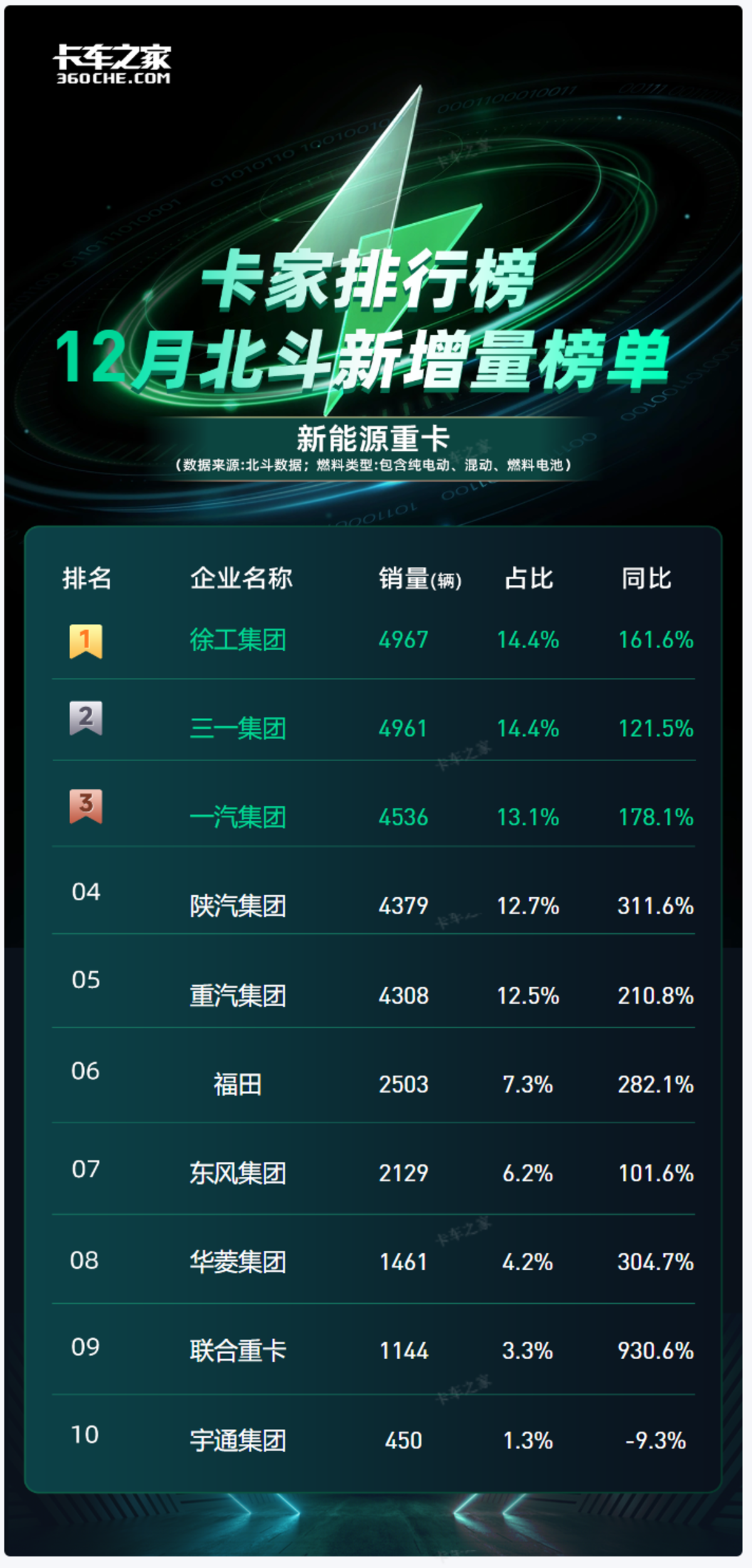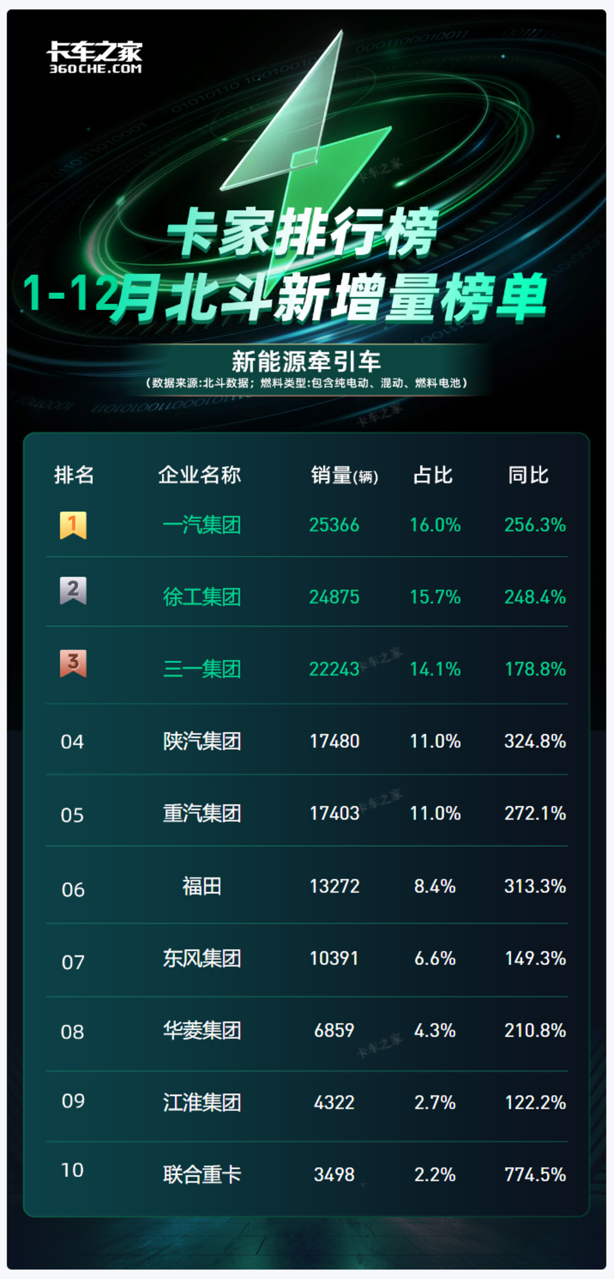 从全年整体、新能源牵引车细分领域,到12月单月整体及牵引车细分榜单来看,行业竞争格局呈现出“头部固化、细分洗牌、月度微调”的鲜明特征。