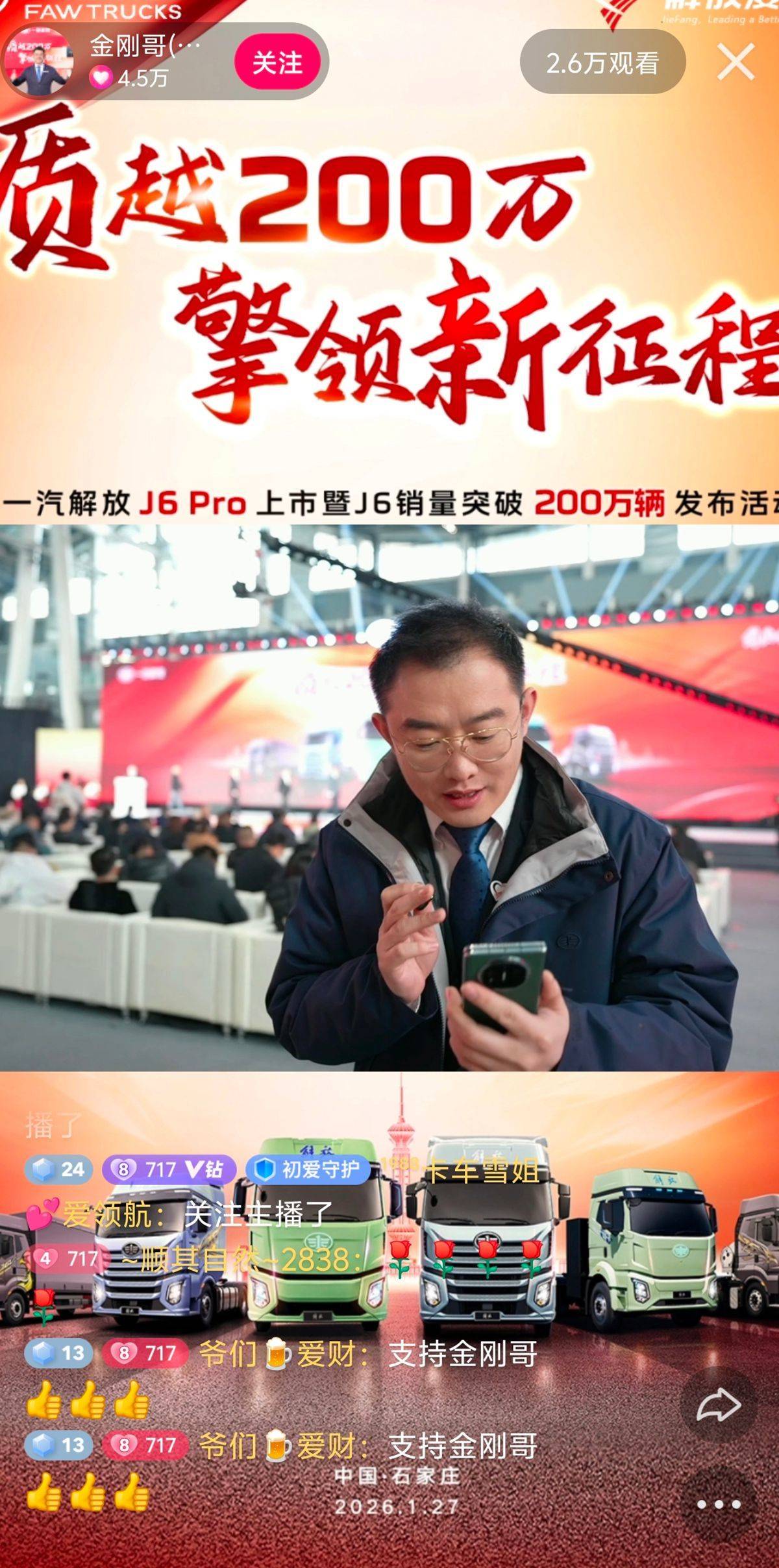 这背后,是一汽解放对发布会模式的大胆革新。不同于传统重卡发布会单向输出的形式,本次活动以“直播间搬上发布会”为核心,联动经销商矩阵与卡友网红扩大传播半径,把线下专业的发布场景和线上“金刚哥(解放爱领航)”直播间实时打通。