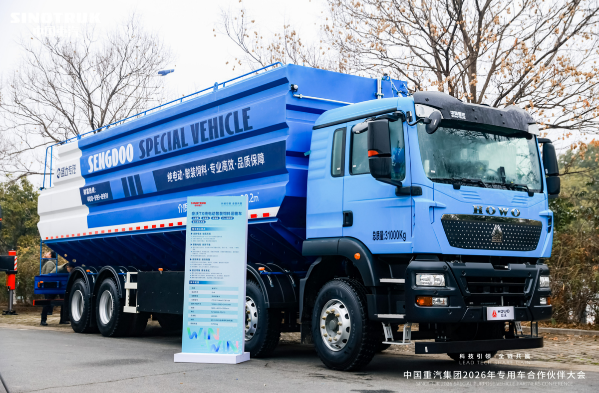 其中,现场亮相的豪沃TX纯电动散装饲料运输车,整车控制由中国重汽自主开发,控制程序与场景达到最佳匹配,实现"一车、一场景、一控制"策略;同时配备额定340kW大功率电机,扭矩大、起步稳,重载动力响应快,还可选装寒区装甲,不惧区域环境限制。