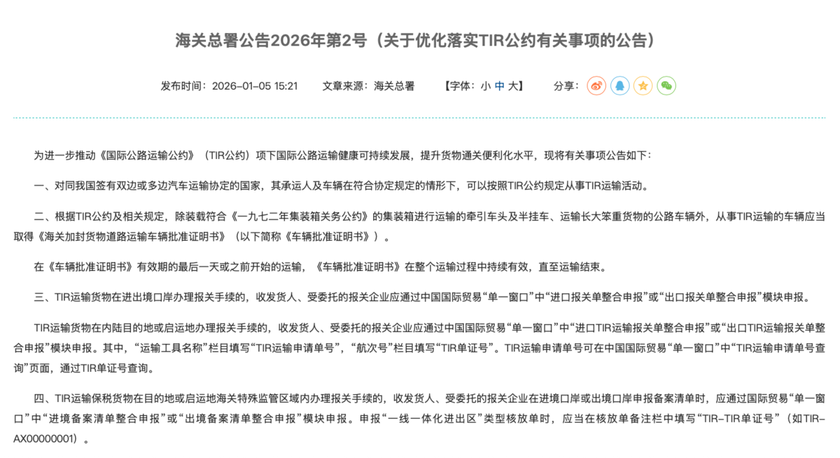 2026年年初,海关总署2026年第2号公告正式施行,这份《关于优化落实TIR公约有关事项的公告》,对《国际公路运输公约》(简称TIR公约)的实施规则进行了全面优化,明确了车辆资质、申报流程、适用范围等核心要求,旨在推动跨境公路运输便利化升级,打通中亚、欧洲等跨境货运通道。