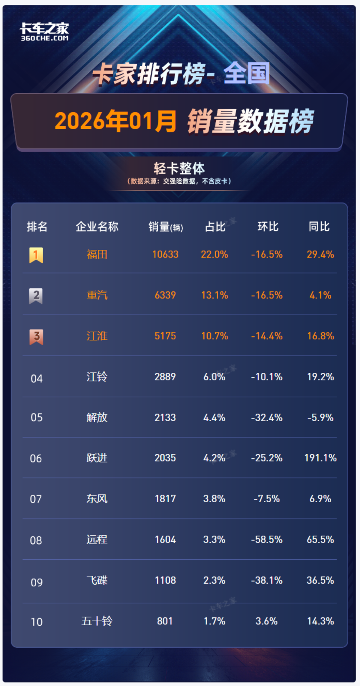 2026年1月全国轻卡市场(不含皮卡)销量榜出炉,福田以10633辆的成绩稳坐第一,占比达22.0%,形成“一超”主导的头部格局。Top3企业(福田、重汽、江淮)合计占比45.8%,Top10合计占比71.5%,意味着七成市场被头部企业占据,竞争格局高度集中。