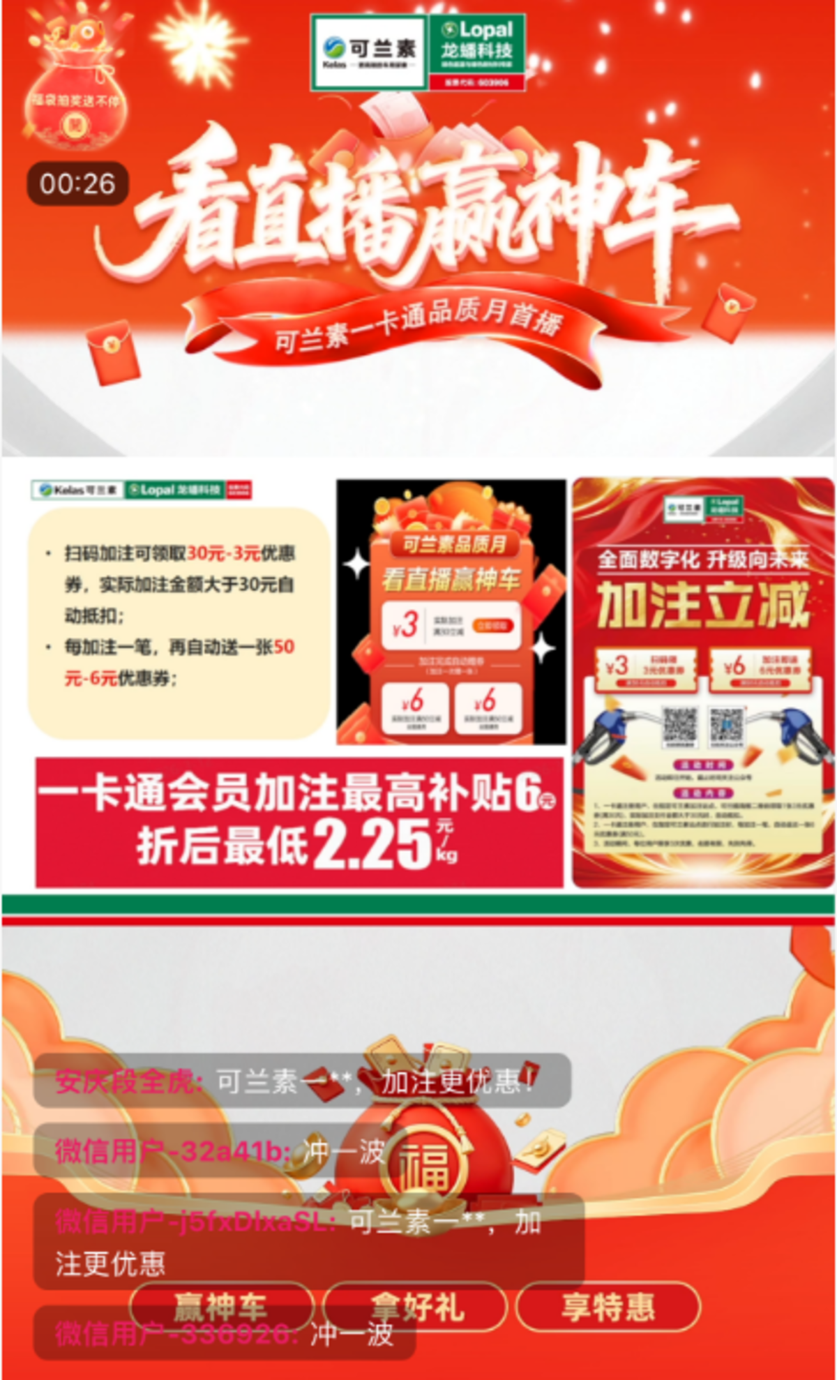 可兰素一卡通推出的专属优惠,让卡友加注更实惠、用车更省心。直播间福利全程不断,福袋好礼、数码家电、汽车大奖轮番送出,实实在在回馈广大卡友。