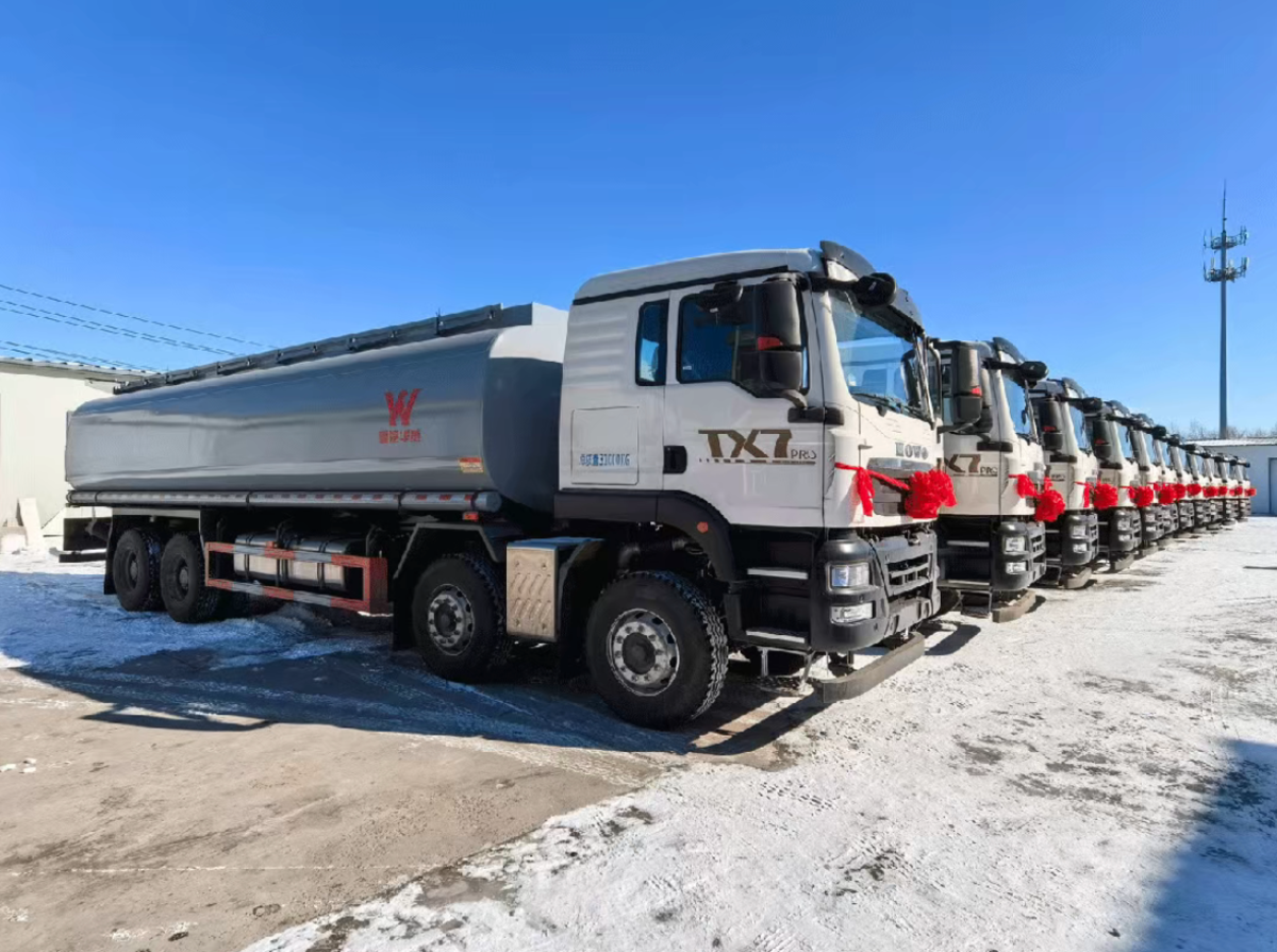 在中国重汽本轮交付版图中,呼伦贝尔的12台油田供液车尤为亮眼。作为整车一体化技术创领者,豪沃重卡针对油田复杂路况与极寒气候,打造高通过性、皮实安全、舒适节油的专属产品。高位全金属保险杠、抬高式水箱等设计有效提升车辆通过性,驾驶室"馈断式"后移技术筑牢安全防线,四点全浮设计兼顾舒适与节油,全方位适配油田作业需求。凭借定制化优势,豪沃油田专用车在"两桶油"体系用户及"三方车队"市场广受青睐,市占率持续攀升,用实力守护能源运输每一程,为首季开门红添力加劲。