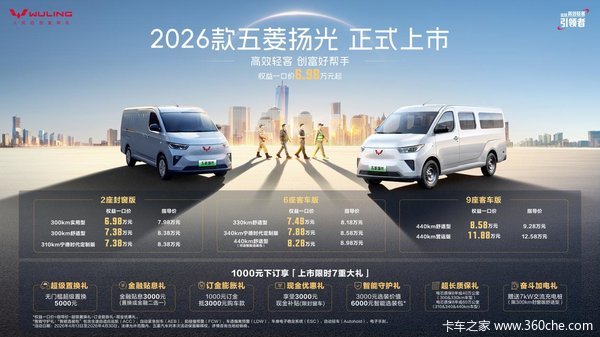 “高效轻客,创富好帮手”。4月13日,2026款五菱扬光通过一场高效创富场景挑战直播正式上市,限时一口价6.98万起!作为新能源轻客标杆车型,五菱扬光已连续24个月蝉联细分市场销冠,本次升级精准聚焦城配司机提升创富效率的核心需求,全新搭载基于五菱"天灵神"技术体系打造的三大商用车专用技术,在维持原售价的基础上,实现"续航加码"、"动力加码"、"智能加码"、"空间大码"的全方位升级。以"只加码,不加价"的诚意助力司机开启高效创富新一程;更用硬核技术定义高效轻客新标准,持续引领行业良性发展。