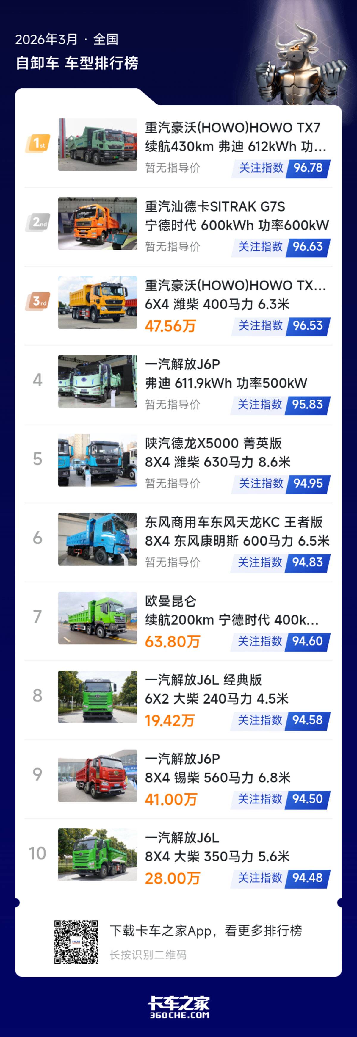 【卡车之家 原创】 本文所有分析均基于卡车之家关注榜发布的2026 年 3 月重型自卸车品类排名数据,覆盖市场主流在售车型的用户关注表现,具备较高的行业参考价值。