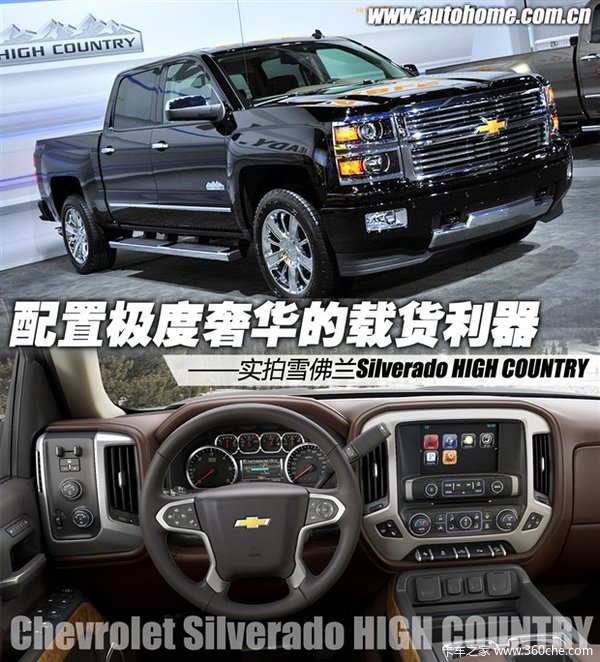 皮卡的主要功用是货物运输,同时还具有一定的载客功能,而在美国,皮卡除了其本应有的装载能力之外,各大汽车制造商在客舱装饰和配置上也迎合美国人的用车习惯,纷纷推出超豪华的皮卡车型。今天我们为大家介绍的是此次2013年洛杉矶车展上,雪佛兰推出了第三代Silverado(曾使用过的中文音译有西尔维拉多,萨尔瓦多等)的顶级车型HIGH COUNTRY系列。