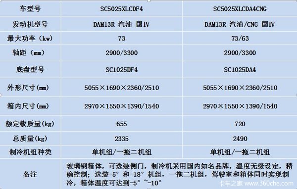 长安神骐冷藏车,是国内唯一一款由整车制造商原厂生产的小型非独立式制冷机组冷藏保鲜车。在中国长安河北基地完成从车辆底盘到上装部件的一体化生产、调试、检测,配置国内知名品牌制冷机组,完美解决了车辆底盘与上装部件的适配性问题,大大提高了冷藏车性能的可靠性和燃油经济性。长安冷藏保鲜车的型号参数见下表: