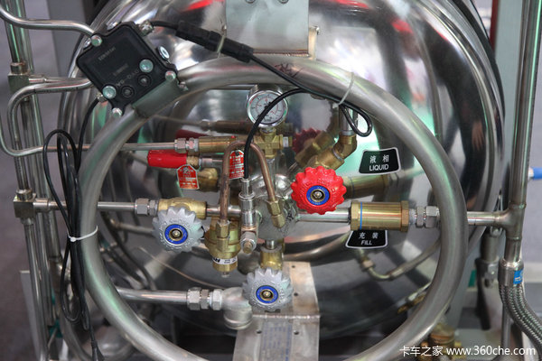 来到查特的室内展台,可以看到查特带来了一款首次独家发售的气瓶,这个气瓶有一个非常大的特点,采用了电控自增压系统。相比普通气瓶少了一根溢管,安全性能更好。以前的老款气瓶都带有一个自增压管道,这个管道在轮胎爆胎或者受外力撞击时,可能会导致一些危险情况出现,存在一定的危险性。