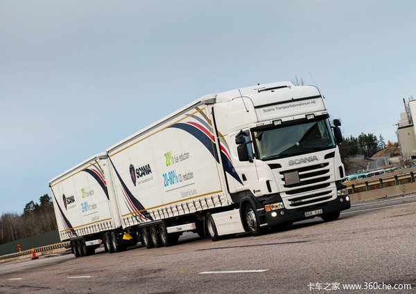 通过牵引两台挂车,斯堪尼亚汽车列车可节省高达30%的燃油消耗,并同等幅度降低二氧化碳排放量。根据斯堪尼亚的请求,瑞典运输署已批准在瑞典南泰利耶和赫尔辛堡之间的道路,可以运营全长达31.5米的汽车列车。