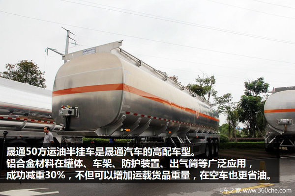 晟通50方运油半挂车是晟通汽车的高配车型。铝合金材料在罐体、车架、防护装置、出气筒等广泛应用,成功减重30%,不但可以增加运载货品重量,在空车时也能降低油耗。