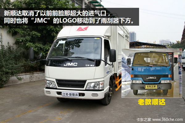 我们可以看到,新款顺达的外观与老款顺达有明显的区别,新顺达取消了以前前脸那超大的进气口,同时也将“JMC”的LOGO移动到了雨刮器下方,前脸的整体造型也不再是以前的大方脸,新款的线条设计得更加圆润。