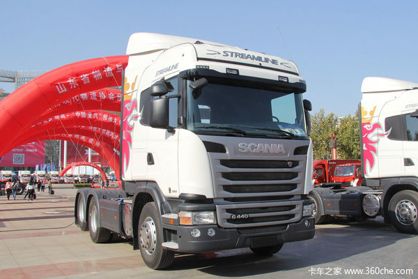 【卡车之家 原创】在2015年10月11日举行的第八届济南卡车展中,进口品牌比较少见,斯堪尼亚成了全场唯一的一家进口品牌卡车,虽然国产重卡销量普遍下滑,但进口车需求依然稳定,其中斯堪尼亚今年的销量就有不错的增长。其在现场展出了两款车型,并且均已找到了买主,下面给大家介绍一下其中一款Streamline系列G440公路牵引车,虽然算不上顶配,但也有很多可圈可点之处。