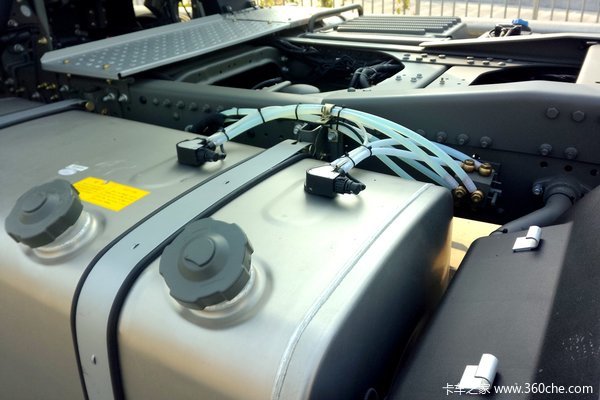 油箱采用铝合金材质,具有质量轻、对柴油污染小的特点,也是目前国内重卡的主流配置。同时原装铝合金油箱在外观上也比较美观,看起来更加的漂亮。