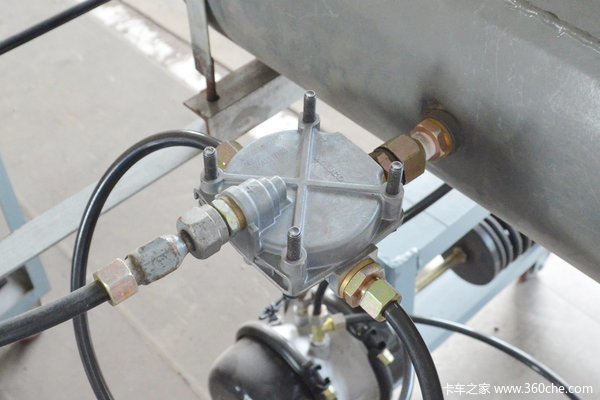 像胡哥试验台安装的这种40升容积一个的储气筒,在挂车出厂时的标准是要配备两个。现在很多大型挂车厂商,比如中集集团就给挂车配备了三个储气筒。胡哥告诉我们,这主要是为了常规制动的情况,在长下坡路段行驶时能够保证刹车制动的供气量。