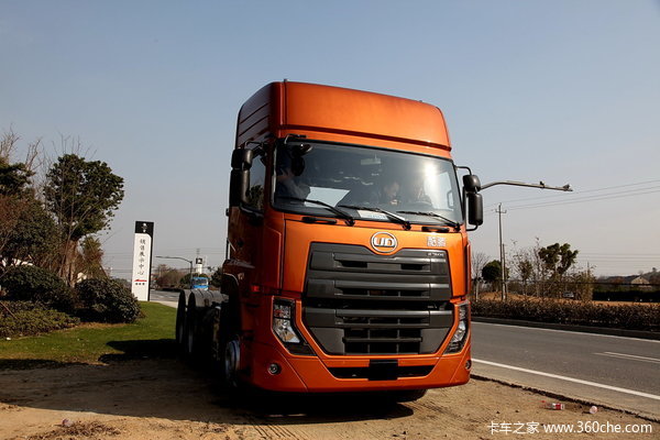 【卡车之家 原创】提起UD,很多人不免想到了天龙,不少人说它仿的是天龙的驾驶室,而实际上恰好相反,天龙的外形源自于上代的UD。尽管它没有天龙那么大的名气,但是它依然拥有不错的实力。在武汉经销商处,UD是与沃尔沃一起销售,他们的售后服务也是一体的,近期我们实拍了一台酷腾430马力的6X4牵引车。