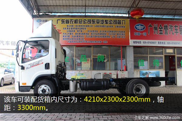 该车可装配货箱内尺寸为:4210x2300x2300mm,轴距为3300mm。