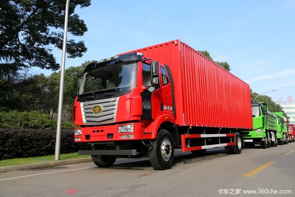 【卡车之家 原创】新GB1589发布之后,一大批为新政而生的新车崭露头角,两轴厢车放宽到12米,意味着货厢能做到9.6米,9.6米大单桥厢车就再度重出江湖,成为快递车市场的又一绝佳选择。近日,在解放年会上我们就实拍了一汽柳特金陆4X2的9.6米厢车。
