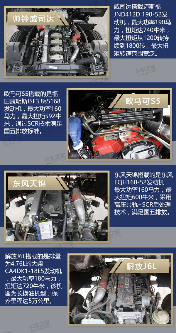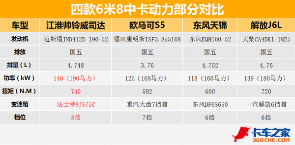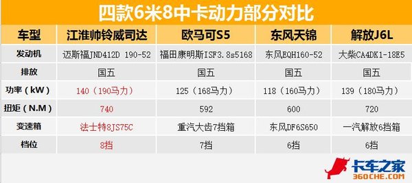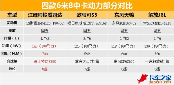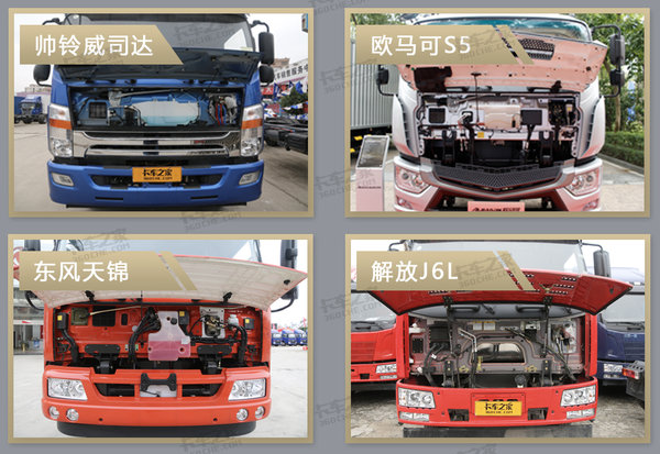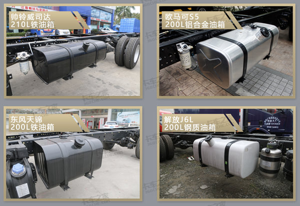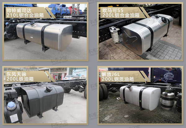 在这四款中卡中,基本上都是采用200L左右的油箱,区别只在油箱的材质方面,只有帅铃威司达和欧马可S5采用了铝合金的油箱材料,这很好的避免了铁油箱由于生锈而导致的油路堵塞。