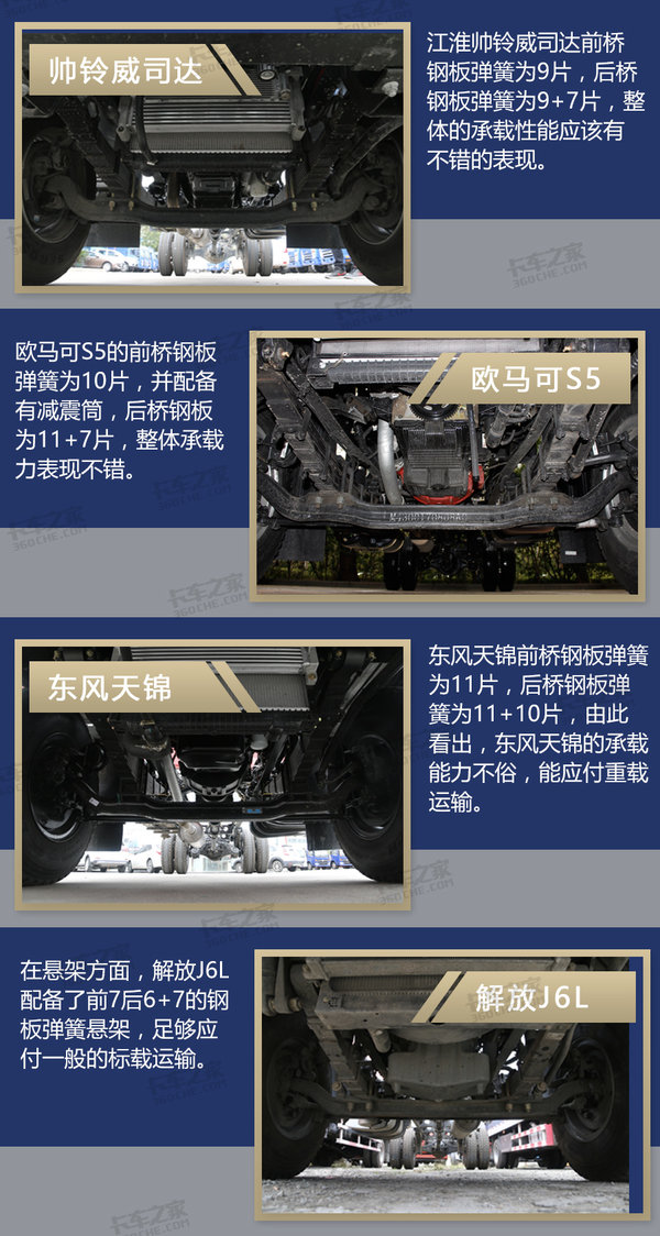 在悬架方面,四款中卡都不相上下,都是主打标载运输。东风天锦的钢板弹簧数量最多,承载能力不俗,但是车辆的载重性能并不是只有悬架决定的,还需要底盘其他部件以及动力系统方面来配合。