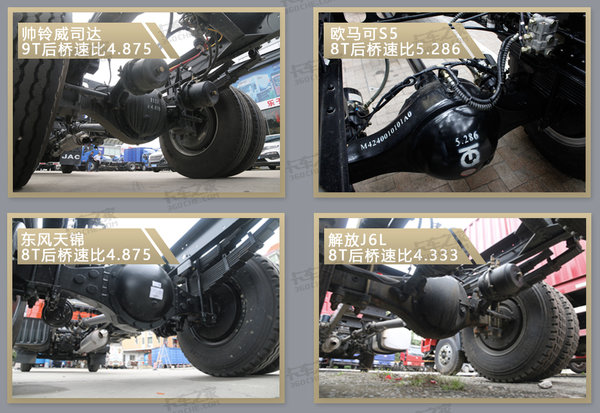 从整个底盘来看,这几款车型的差别都不大,基本能满足用户一般的运输需求,也是目前主流中卡的配置,但就载重性能而言,配备9吨级后桥以及10R22.5轮胎的江淮帅铃威司达可能性能更加出色。