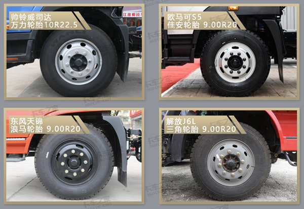 与后桥一样,轮胎也影响着车辆的载重性能,主流的中卡一般都会是装配9.00R20的轮胎,基本能满足一般运输的载重要求,而江淮帅铃威司达则选装了10R22.5尺寸的轮胎,拥有更为优秀的载重能力。