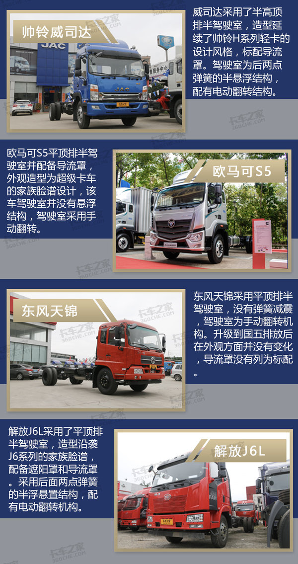 由于目前卡车司机的观念正在慢慢的改变,车辆的舒适性逐渐开始成为卡车司机的购车要求之一,一款好的中卡,不仅要可靠、动力好,同时也要开得舒服。在驾驶室方面,这四款中卡各有优势,下面就来看看这四款中卡在舒适性方面有怎么的表现。