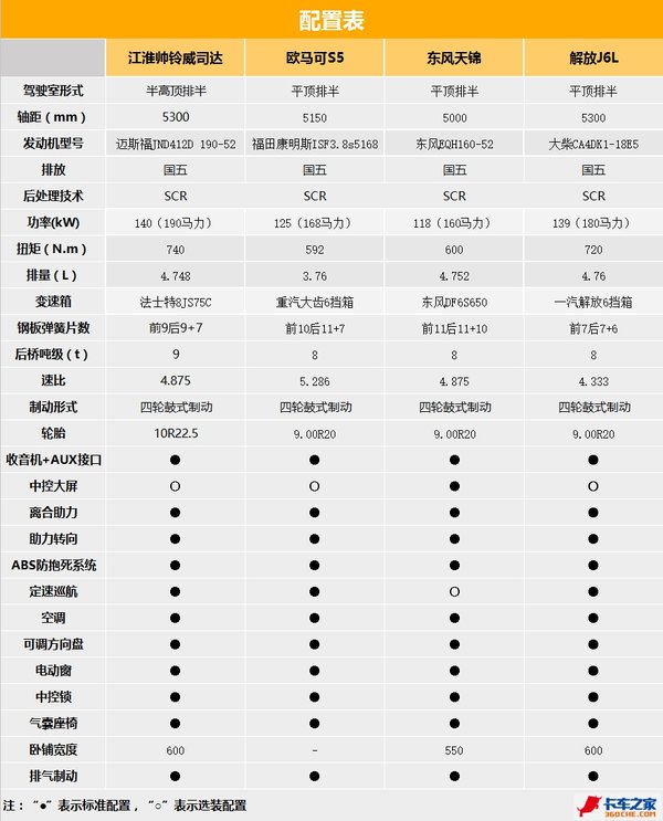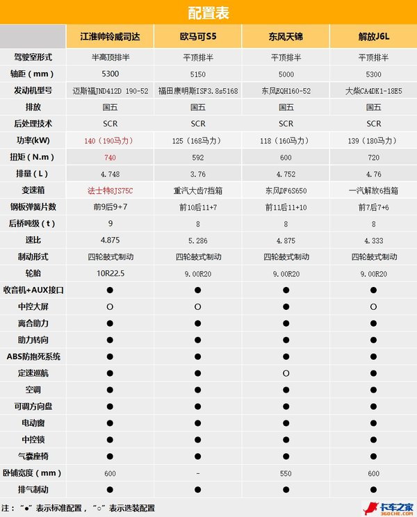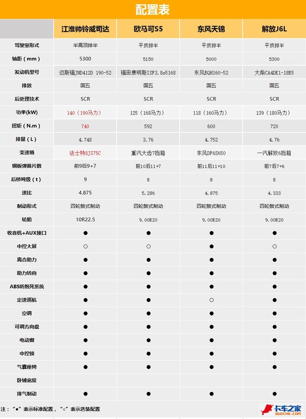 经过对比,这四款中卡都有各自的优势,东风天锦以及解放J6L是中卡市场里的老将,在目前的中卡市场拥有着非常不错的占有率和口碑。江淮帅铃威司达则是一名后来居上者,凭借着高端的配置以及较为出色的动力性能从两名老将中抢夺了不少的市场占有量,而欧马可S5则是目前最新的产品,从目前来看,无论是外观设计还是配置方面都颇具竞争力,剩下的只有等真实的市场反应了。