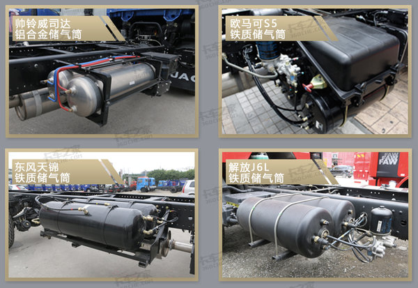 这四款车型的制动都采用了气制动的形式,因此储气筒就必不可少了。在主流的中卡上,一般使用的都是铁质储气筒,而江淮帅铃威司达则是采用了铝合金材质的储气筒,重量更轻并且避免了由于内部生锈导致管路堵塞的情况发生。
