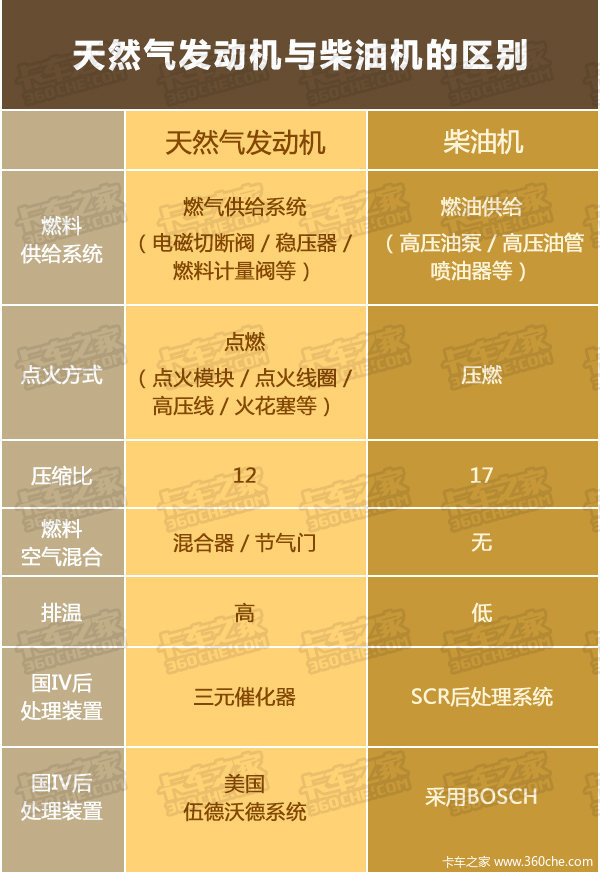 目前市面上的燃气车基本都以天然气为单一燃料,发动机是由成熟的柴油机改型而来,既然现在的天然气发动机是由柴油机改型而来,那它们之间有什么不同呢?