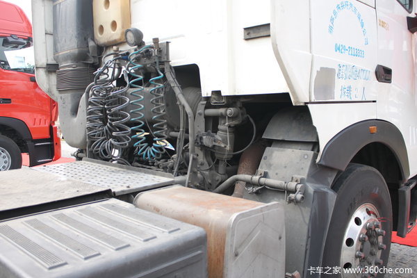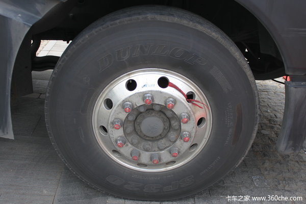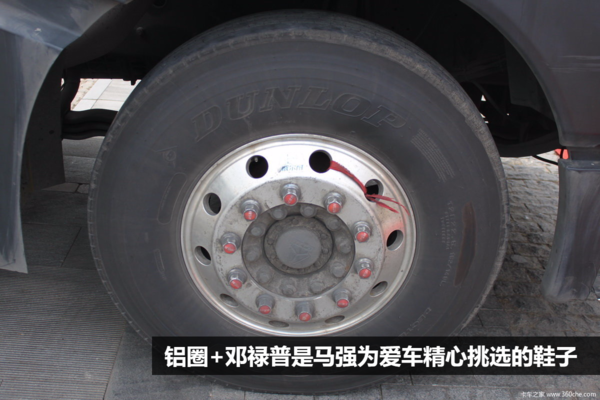 为了安全和美观,马强为心爱的大T7买了一双漂亮的鞋子,铝合金轮辋配上邓禄普无内胎子午线轮胎也在无形中提升了逼格。轮毂上特有的一圈大螺丝告诉我们这是一条盘式制动的前桥,哪怕是今天,盘式制动前桥尚未成为国产重卡的标配。