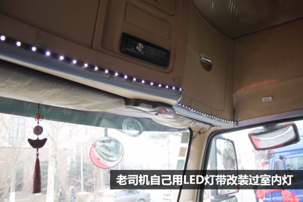 作为一名老司机,动手能力有的放矢,马强在顶柜边缘加装的LED灯带不仅是为了打扮心爱的T7H,更多是为了让晚上的驾驶室内部更明亮一些。