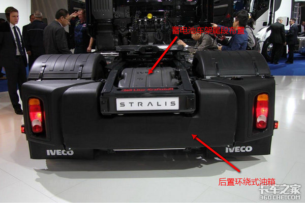 至于蓄电池,车架尾部安装也不是什么难事,2014年汉诺威车展展出的150周年纪念版牵引车不仅蓄电池布置在车架尾部,还在车尾加装了一个大约260升的环绕式油箱。
