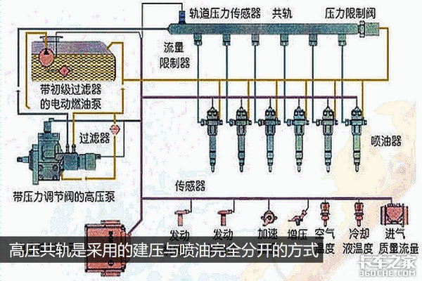 高压共轨全称叫做电控高压共轨,简单的说就是由一个油泵产生高压柴油,再将高压柴油储存倒共轨管里,由ECU根据各传感器的数据计算出最佳喷油正时和喷油量,再由电控的喷油器喷入汽缸进行燃烧。它的最大特点是产生压力和喷入汽缸的过程完全分开,这样的好处是能保证每个喷油器的喷射压力一致,并且可以做到多次喷射,使燃烧更完全排放更佳。
