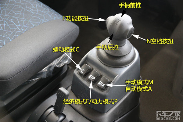 变速箱的操作手杆比较简单,就跟开小车一样。不过需要指出的是,该车配备的C挡为爬行模式(蠕动功能)。据介绍最新的蠕动功能仅需要控制刹车踏板来实现车辆的速度控制,这就使得重车在坡上蠕动时更容易了。激活方法:双击换挡手柄上的“C”按键,即可以进入此蠕动功能。