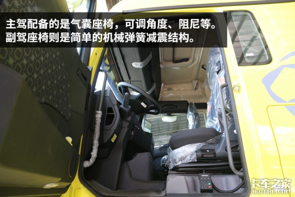在舒适性方面,该车主驾驶配备了多功能气囊减震座椅,可调节腰部支撑、背垫、座椅阻尼力调整等功能,同时副驾驶为机械减震(选装配置),正常是配备普通座椅。