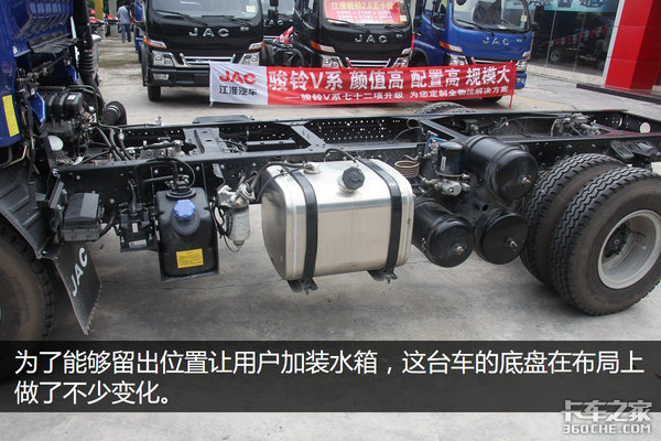 为了能够留出位置给用户加装水箱,这台车的底盘在布局上做了不少变化,尿素罐、120升的铝合金油箱、储气筒都被布置在了一侧,另一侧则留出了大量的空间。