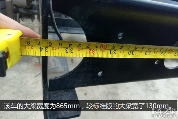 这台骏铃E6的大梁采用了中重卡的直通式大梁设计,大梁宽度为865mm,较标准版的大梁宽了130mm。