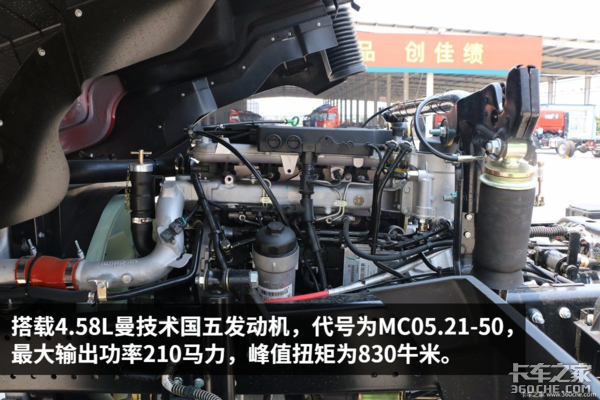 在动力方面,这台车搭载的是曼MC系列发动机,代号为MC05.21-50。这台4.58升的机器最大输出功率为210马力,峰值扭矩达到830牛米。这个数据算得上是目前中卡级别的佼佼者,据悉后期还将完善6缸发动机版本车型。