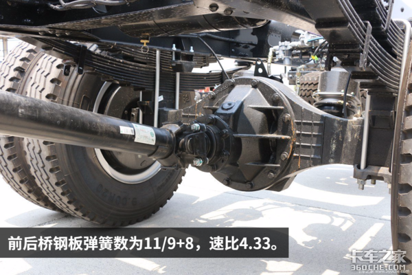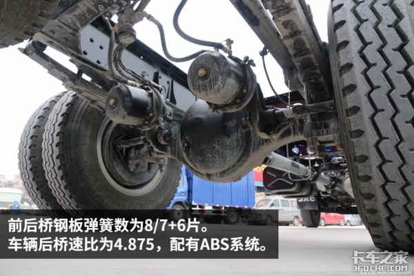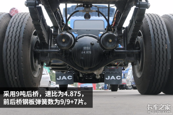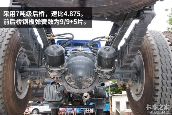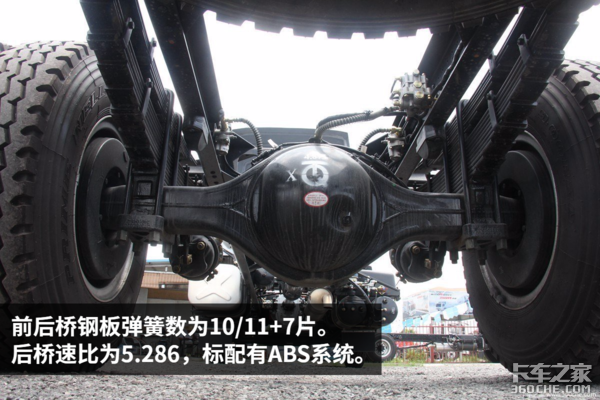 底盘方面这款车有两个选装配置:1.曼技术前桥,配盘式制动;2.前少后少钢板弹簧,适合快递物流。