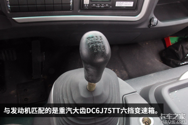 与发动机匹配的是重汽大齿DC6J75TT六挡变速箱。用户还能选装大齿7挡或者采埃孚变速箱,不过采埃孚变速箱的版本售价相对会高一些。