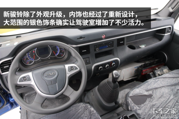 配置方面,这款车配有空调、车载广播系统、电动车窗、多功能钥匙等配置。全新的骏铃除了外观升级,内饰也经过了全新设计,大范围的银色饰条确实让驾驶室增加了不少活力。