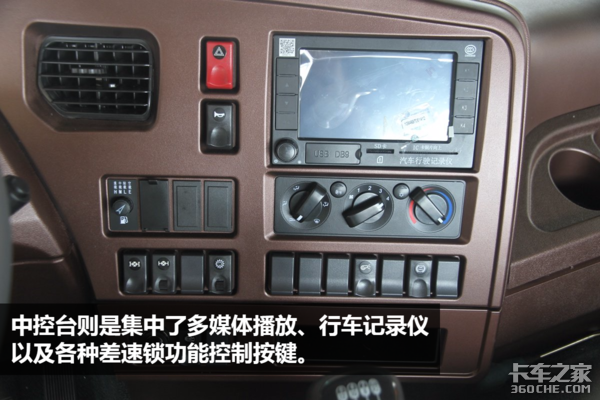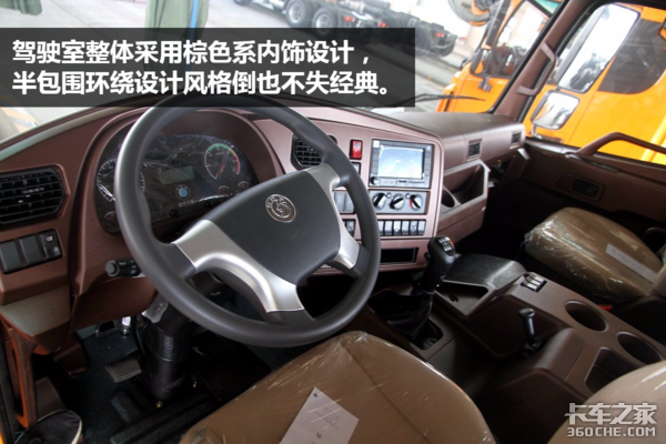 由于自卸车一般情况下运行半径都不会太远,平顶驾驶室足以应付大多数情况。即便是如此,这款重汽王牌W5G的驾驶室做工仍值得称赞,内饰风格及功能区设计都非常不错。