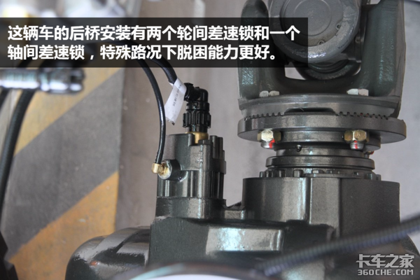 后桥带两个轮间差速锁和一个轴间差速锁,在特殊路况下可以通过锁住差速器来使半轴处于刚性连接状态,从而摆脱困境。