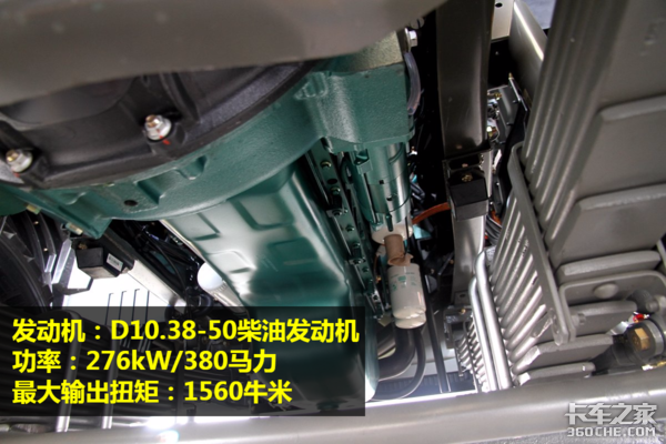 这台重汽王牌自卸车搭载的是一台基于斯太尔技术研发的柴油发动机,型号为D10.38-50。最大输出功率276千瓦/380马力,最大输出扭矩可达到1560牛米。并且,这款发动机现已满足国五排放标准。