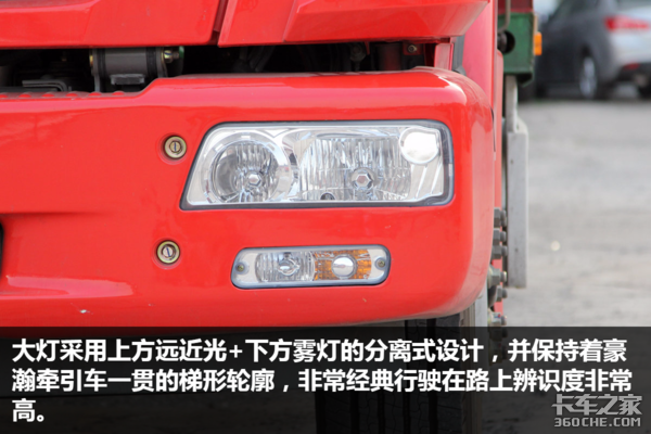 车前脸下方大灯采用上方远近光+下方雾灯的分离式设计,并保持着豪瀚牵引车一贯的梯形轮廓,非常经典,行驶在路上辨识度非常高。后视镜采用一体式设计更加牢固,外加照地镜和补盲镜的多镜片组合,让驾驶员拥有更广泛的视野范围,保证行车安全。